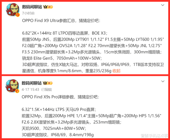 大众皆知,OPPO将在成齐崇拜发布Find X9s Pro和Find X9 Ultra两款年度旗舰,而临发布前终末一天,两款新机的好意思满参数照旧全面曝光了。