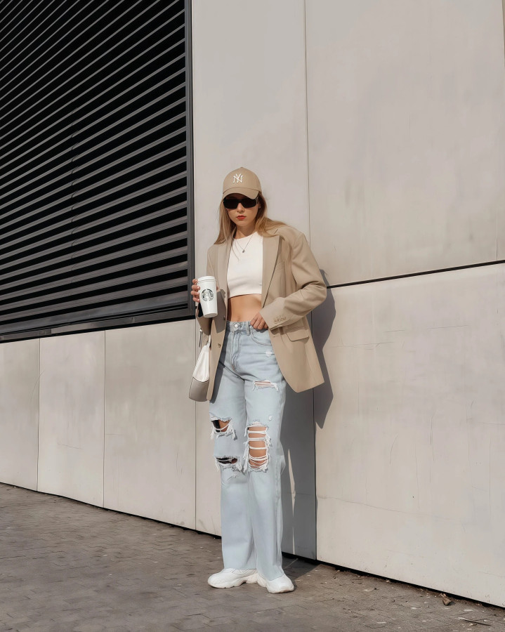●西装外衣配阔腿牛仔裤,打造都市丽东谈主感