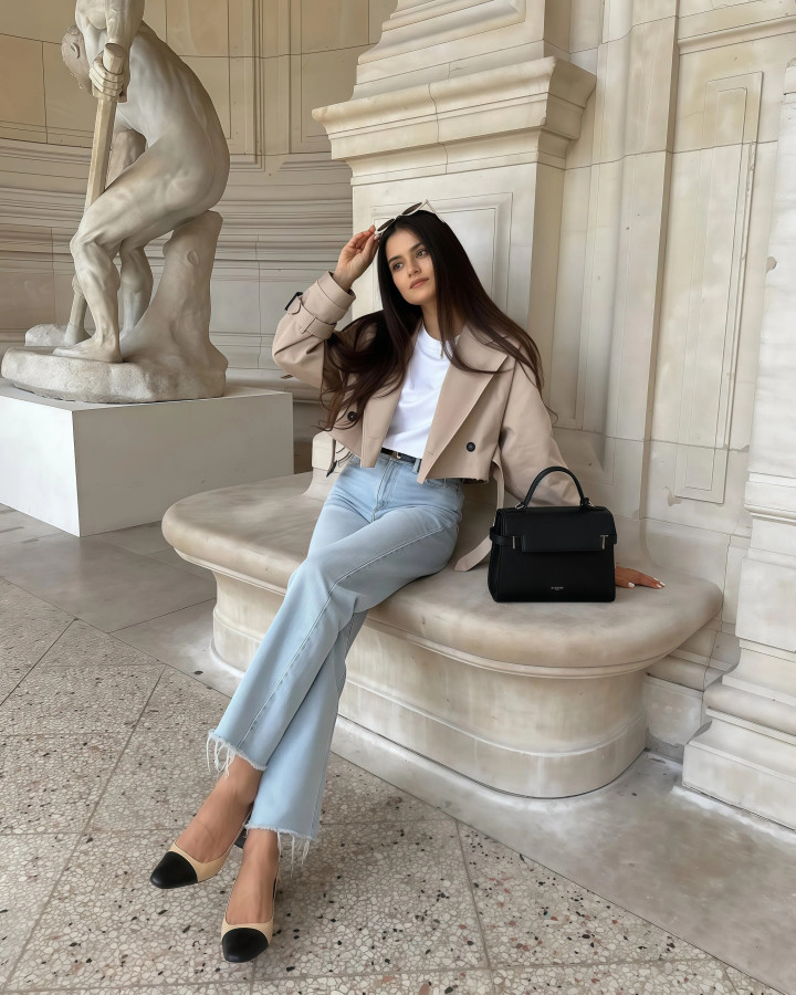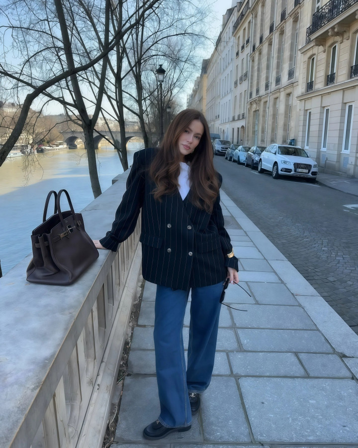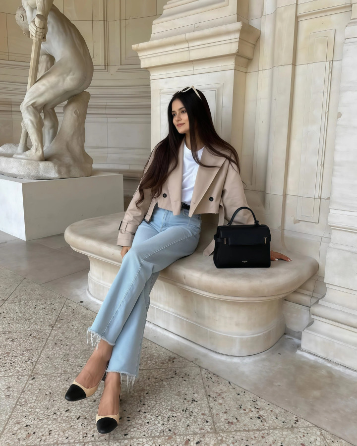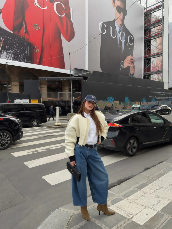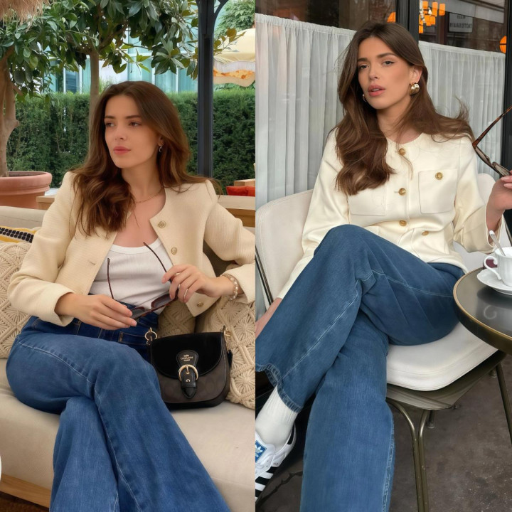小香风外衣天生带着一股概述劲儿,单穿容易显得太“端着”,但你用一条赋闲的阔腿牛仔裤,去接住它,就不错将厚爱和无礼之间的均衡点就踩得很准,穿去上班不会过于松驰,周末出街也不会太庞杂。