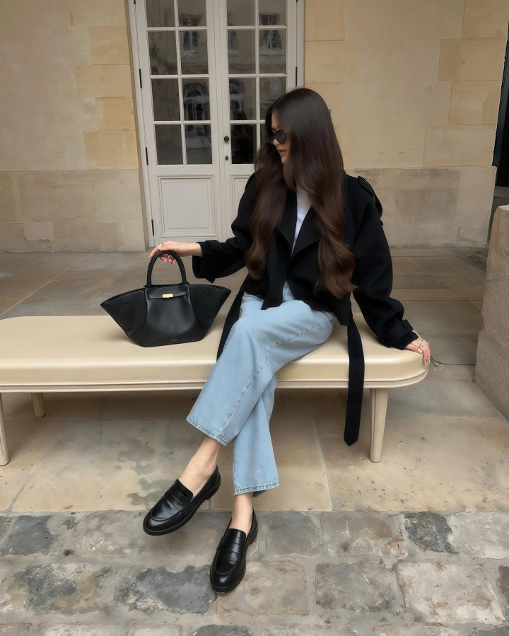 ■风衣外衣配牛仔阔腿裤,通勤出行的好搭子