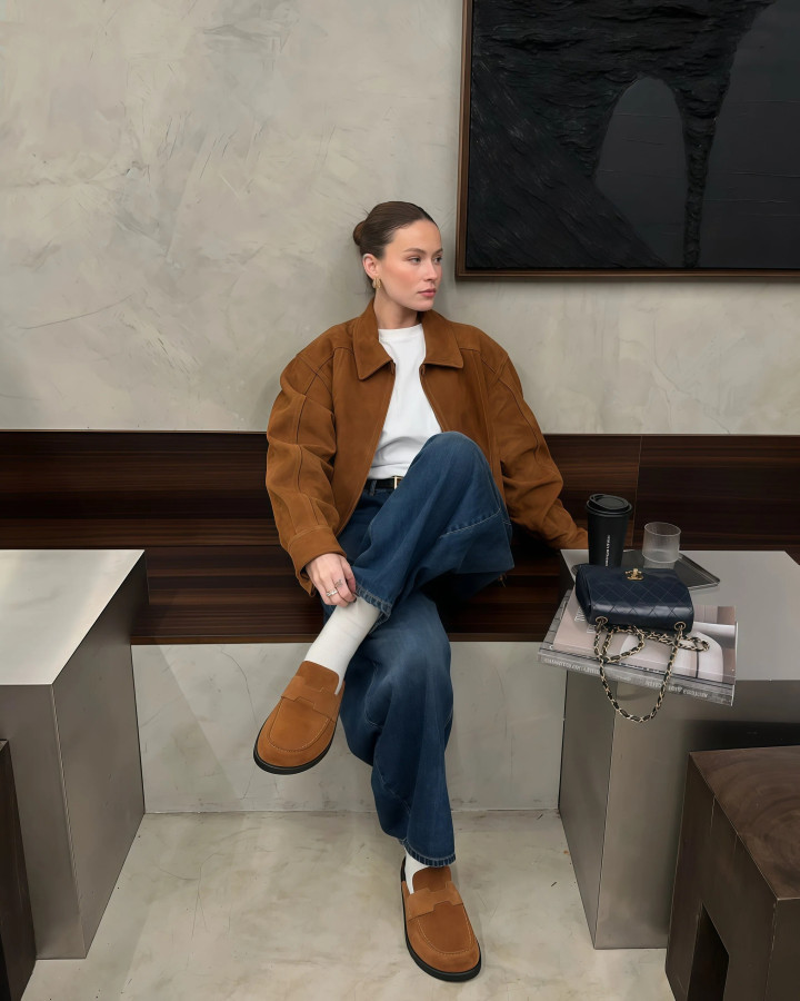 思要把乐福鞋穿出相沿感,越浅近越好,麂皮材质的贪图,浅近高等又不失机尚感,和阔腿牛仔裤放在沿路,有一种不刻意的闲雅,你只需要遴荐一对低跟的形态,就能眨眼间举高身高,优化你的形体比例。