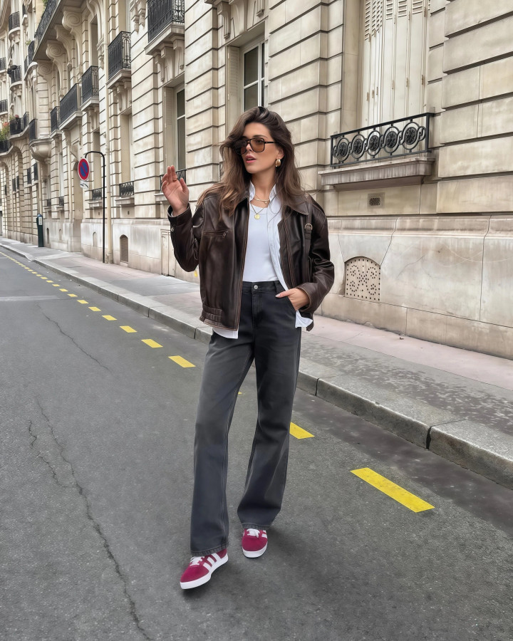 思要帅气的街头风,皮夹克配阔腿牛仔裤,这组公式你闭眼抄就好了,硬朗的牛仔裤,配上利落的皮革夹克,眨眼间就注入了“街头风”的灵魂,这两种又刚好是吞并个调性,搭在沿路绝不违和,还很是有立场。