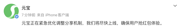 2月4日,元宝回应被微信屏蔽:正在紧急优化调整分享机制,我们将尽快上线,确保用户抢红包体验。