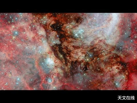 这片花式中布满了浓密的冷氢气云,它们误解交叠,造成了脊状结构、中空的气袋和发光的丝状物。在这些安静的云团深处,重生的恒星正开动耀眼。它们热烈的能量激勉了周围的氢气,快乐彩使其发出浓郁的红色光辉,勾画出气体的结构。