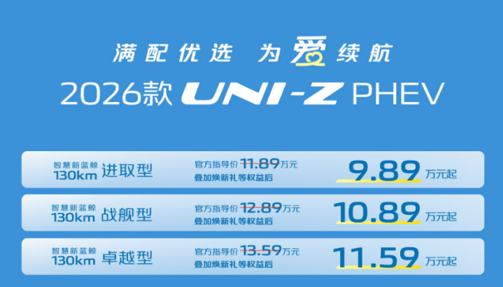 最近念念选家用插混SUV的一又友,又多了一个性价比选项——长安2026款UNI-Z PHEV刚上市,访佛权利后9.89万起的价钱,再加上针对家庭出行的各项建立升级,在10万级这个区间里,算是把“实用”两个字焊死了。