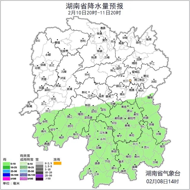 9日晚上至10日白天,湘中以北小雨转多云,其他地区阴天有小雨;北风2~3级;最低气温湘西北1~3℃,其他地区4~7℃;最高气温湘西北、湘东南12~16℃,其他地区8~11℃。